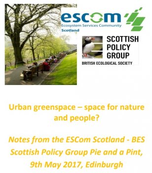 The British Ecological Society’s (BES) Scottish Policy Group (SPG) teamed up with the Ecosystem Services Community (ESCom) Scotland to run their first joint event, a pie and a pint night on urban greenspace. Discussions were focussed on the question: ‘Are the provision and management of greenspace