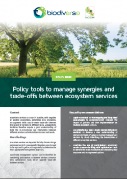 The brief on “Policy tools to manage synergies and trade-offs between ecosystem services” presents how the results from the BiodivERsA-funded CONNECT, REGARDS, TALE and VITAL projects use optimization and participatory tools to quantify synergies and trade-offs between multiple ecosystem services,