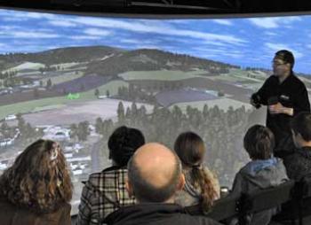 The Virtual Landscape Theatre (VLT) is a mobile curved screen projection facility, in which people can be 'immersed' in computer models of their environment to explore landscapes of the past, present and future. This facility is the first mobile unit of its kind in the UK, and is used for